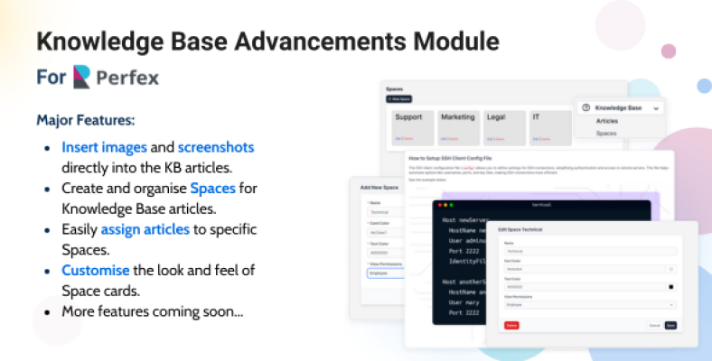 Take your knowledge management in Perfex CRM to the next level with Knowledge Base Advancements. This module enhances the standard knowledge base by enabling seamless image pasting, improving article organisation, and introducing a structured way to manage content. With the addition of Spaces, you can group related articles under a common category, making information more accessible. Customisable space cards allow further personalisation, creating a well-structured and user-friendly knowledge hub.